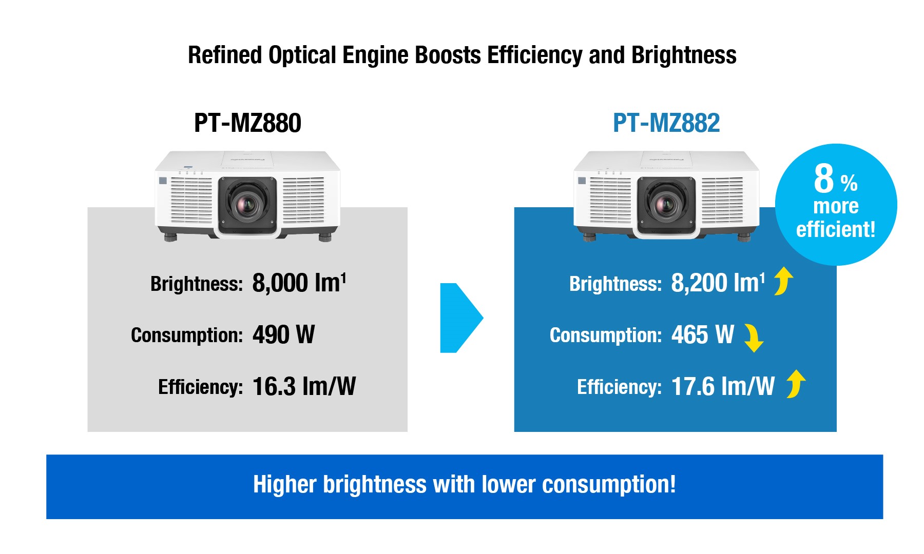 İşte karşınızda Panasonic MZ882, şimdiye kadar en sürdürülebilir ve verimli projektörümüz. 8.200 lumene kadar olağanüstü parlaklığıyla, MZ882 her ortamda canlı ve net görüntüler sağlar, iyi aydınlatılmış alanlar için ideal bir seçimdir.